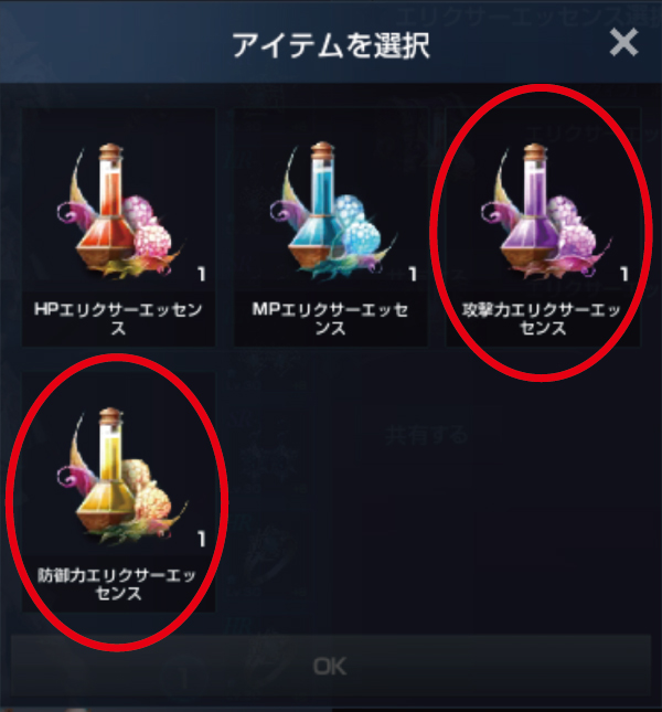 選択ボックスで選ぶべきアイテムは、【攻撃力エッセンス】か【防御力エッセンス】です。