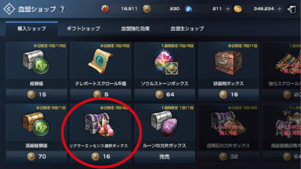 毎日、血盟ショップで【エリクサーエッセンス選択ボックス】を買う!
