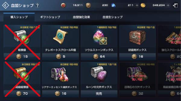血盟ショップでは、血盟コインを使って様々なアイテム・経験値を買う事が出来ます。