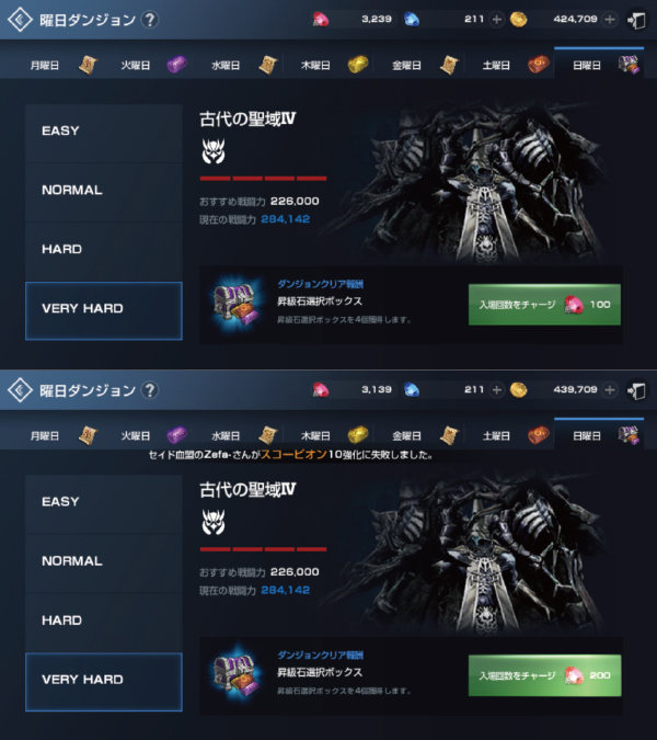 1日で合計3回、赤ダイヤ300個を消費すると昇級石が12個手に入る計算になります。