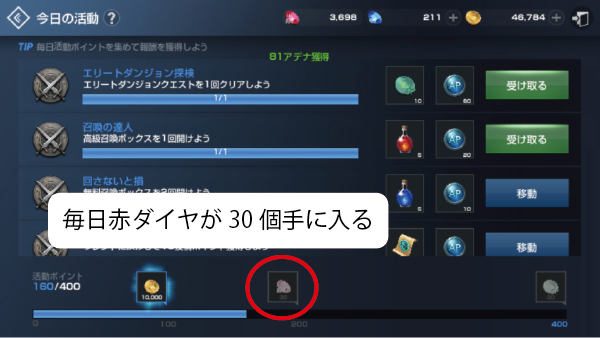 を行っていると、1日に30個の赤ダイヤをもらう事ができます。