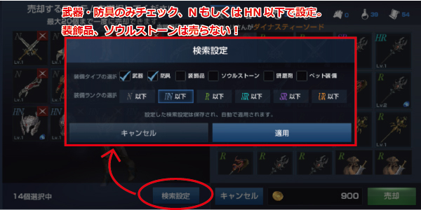 【検索設定】では、よく手に入る【武器】【防具】にチェックを入れて、レアリティーの低い【N】【HN】あたりにチェックを入れて設定すると良いでしょう。