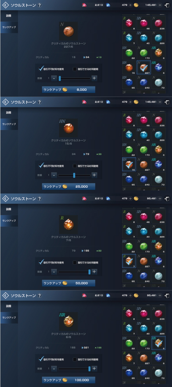このNランクのソウルストーンを1つづつランクアップしてURのソウルストーンを作ってみましょう。